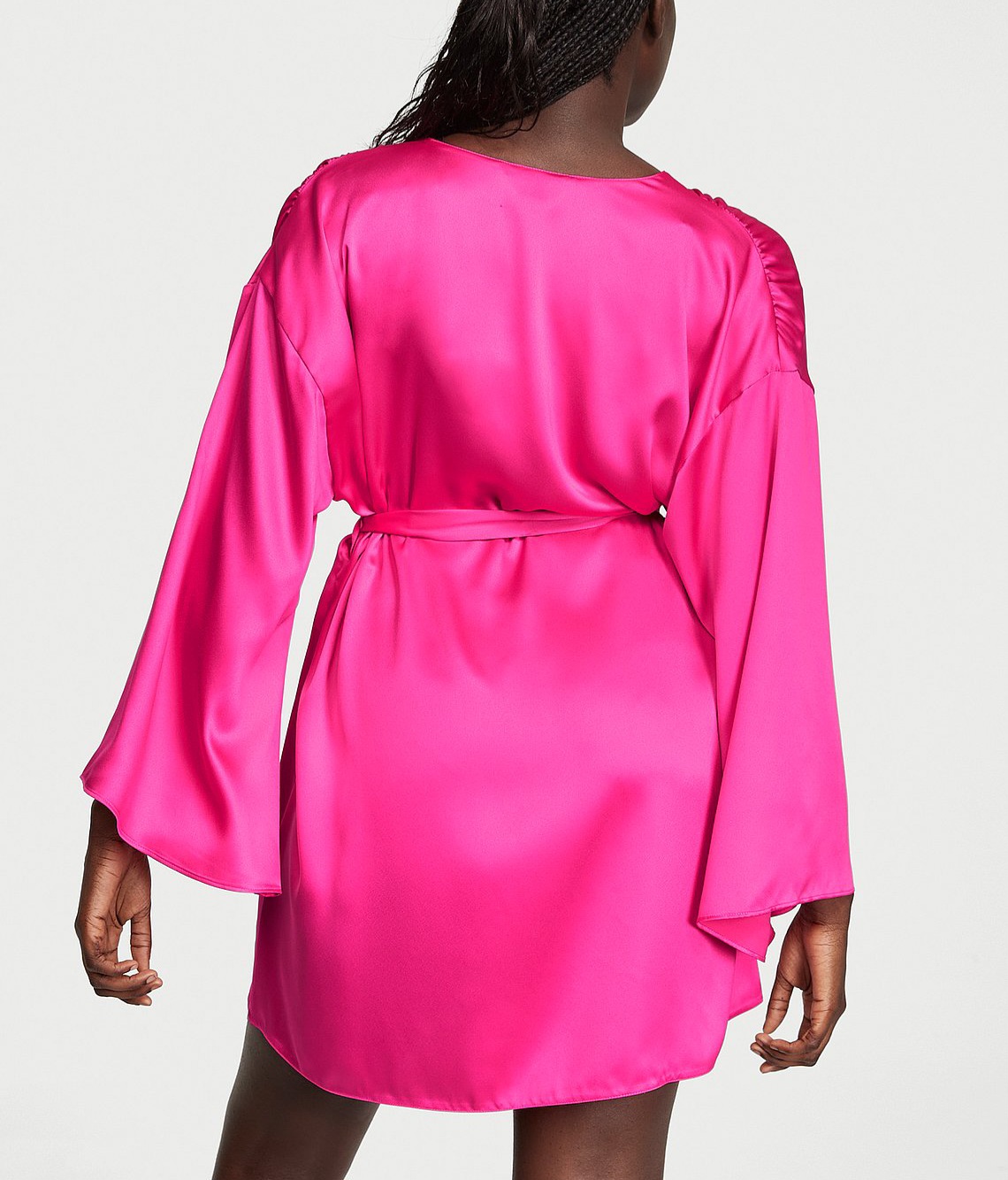 Тільки не кажи, що деталі не важливі, допоки не побачиш його. Глянцевий дизайн, округлені краї у вигляді тюльпана, і ніжне плісе на плечах – саме вони роблять цей атласний халат таким особливим.